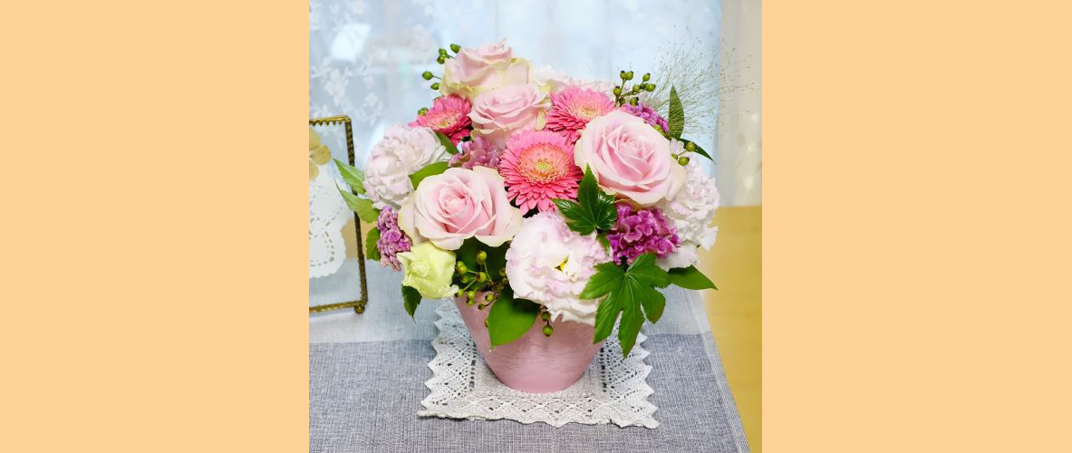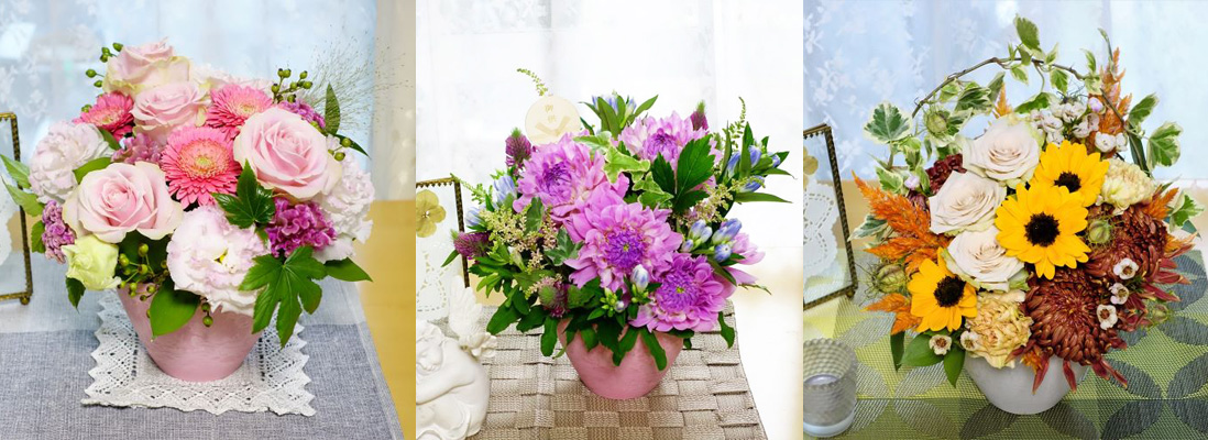 当店の生花アレンジメントは、季節や市場の入荷状況によって