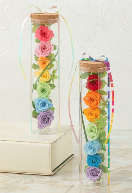七色のバラの花を、ガラスの器に閉じ込めました。
