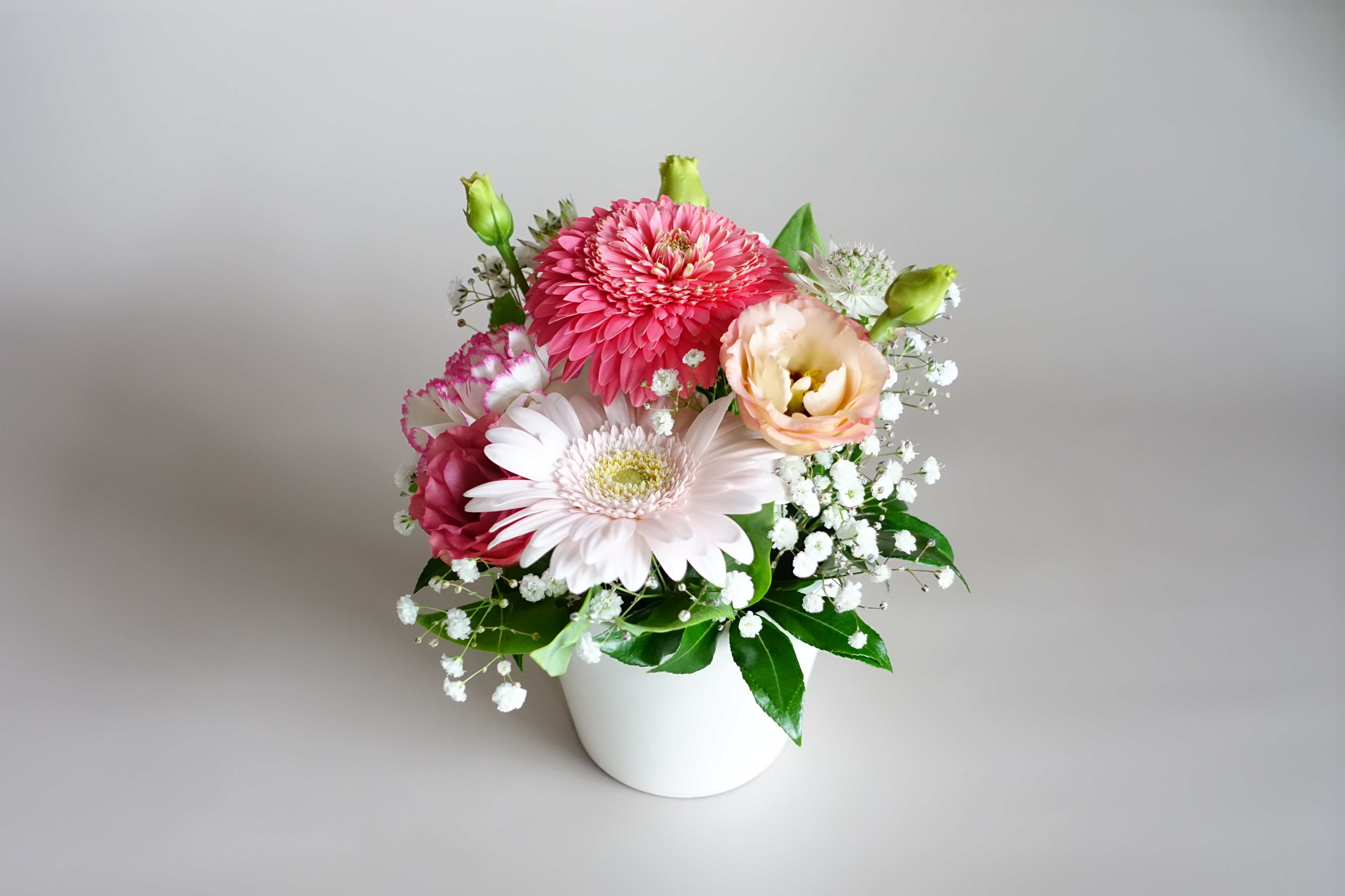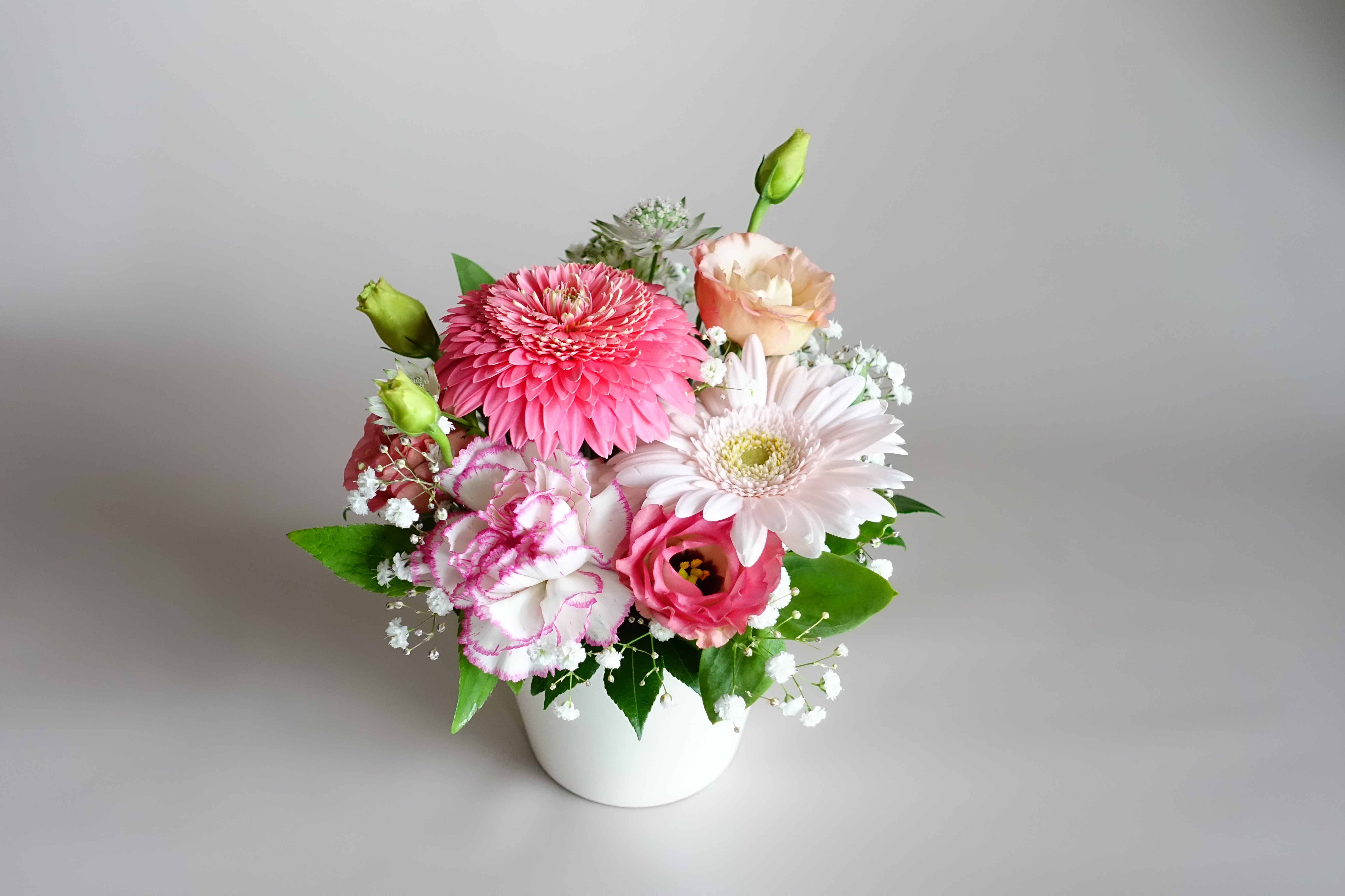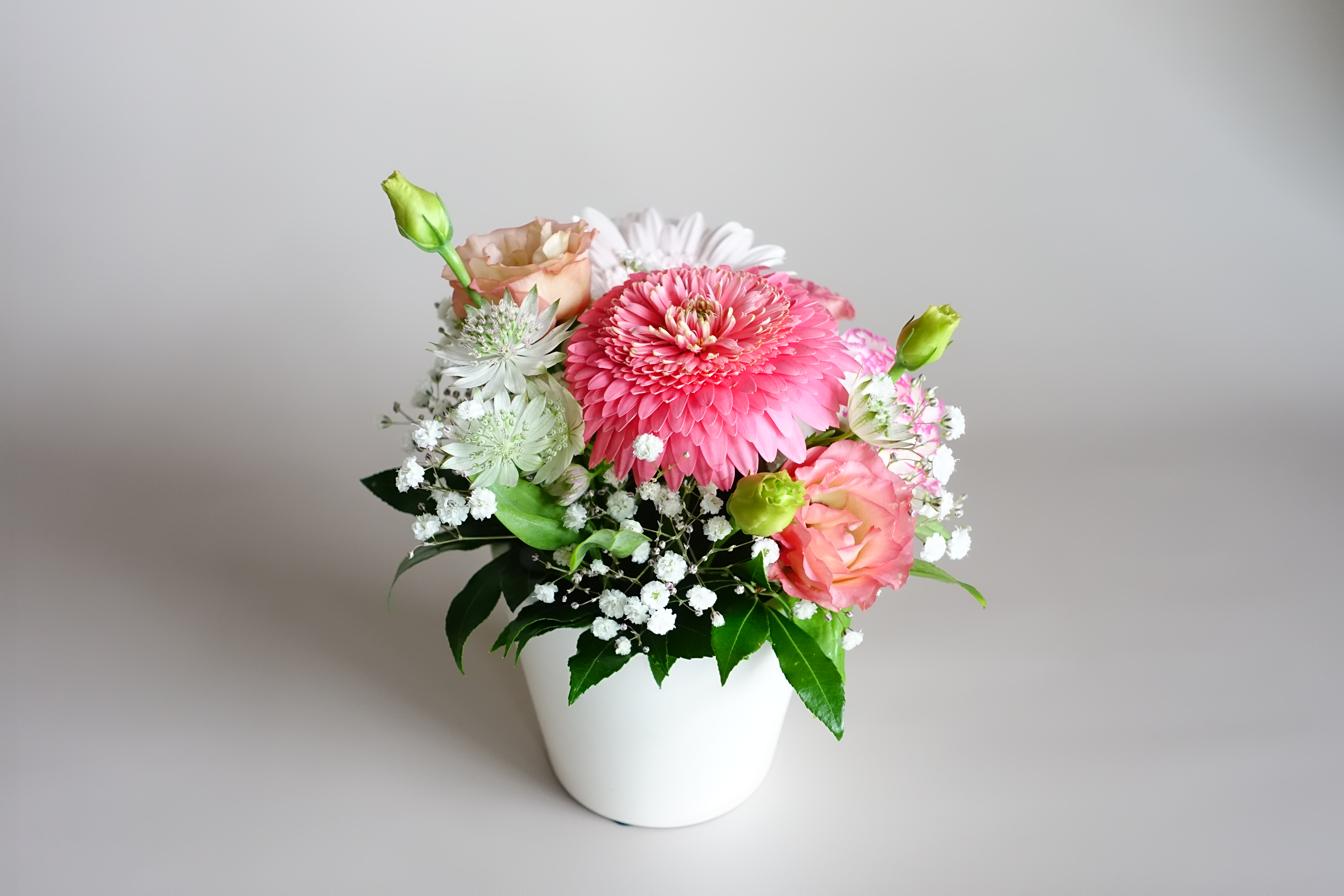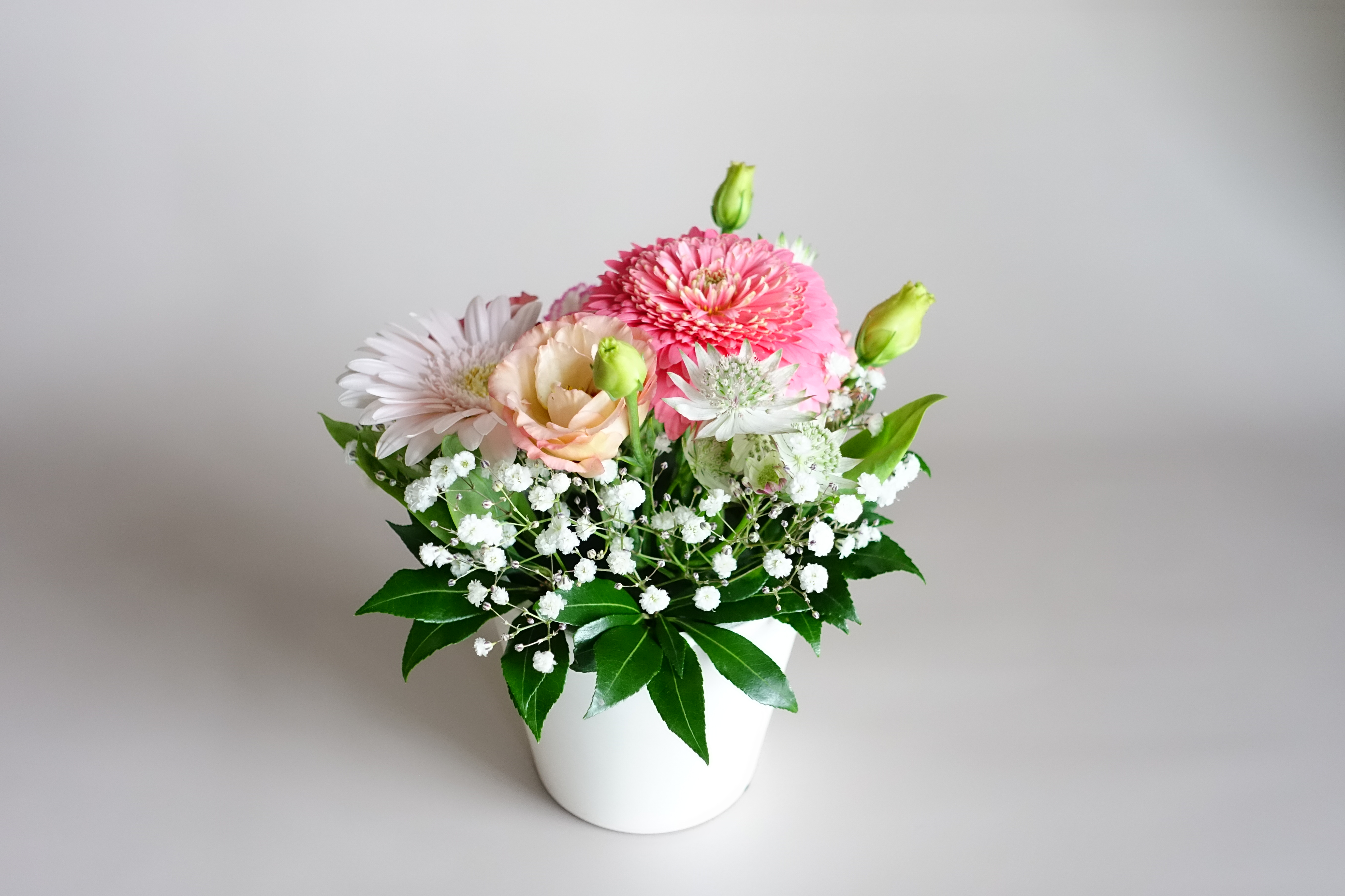 ペットのお悔やみ ミニサイズで飾りやすい生花アレンジメント(ピンク)