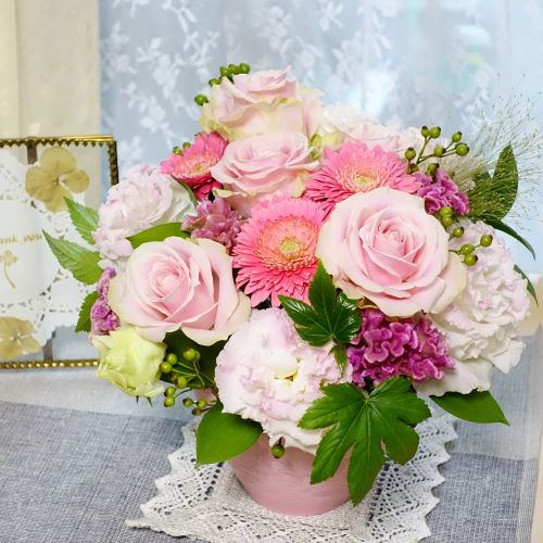 生花を使用したアレンジメントです。やさしいピンク色をメインに、長く飾れるお花を厳選してお届けします。たくさんの「ありがとう」の気持ちをこめて・・・